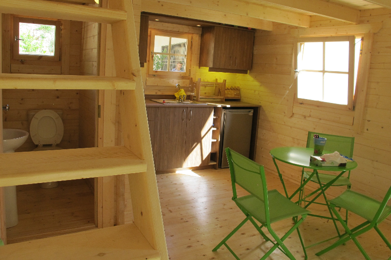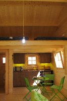 A camping hut with upstairs a sleeping platform