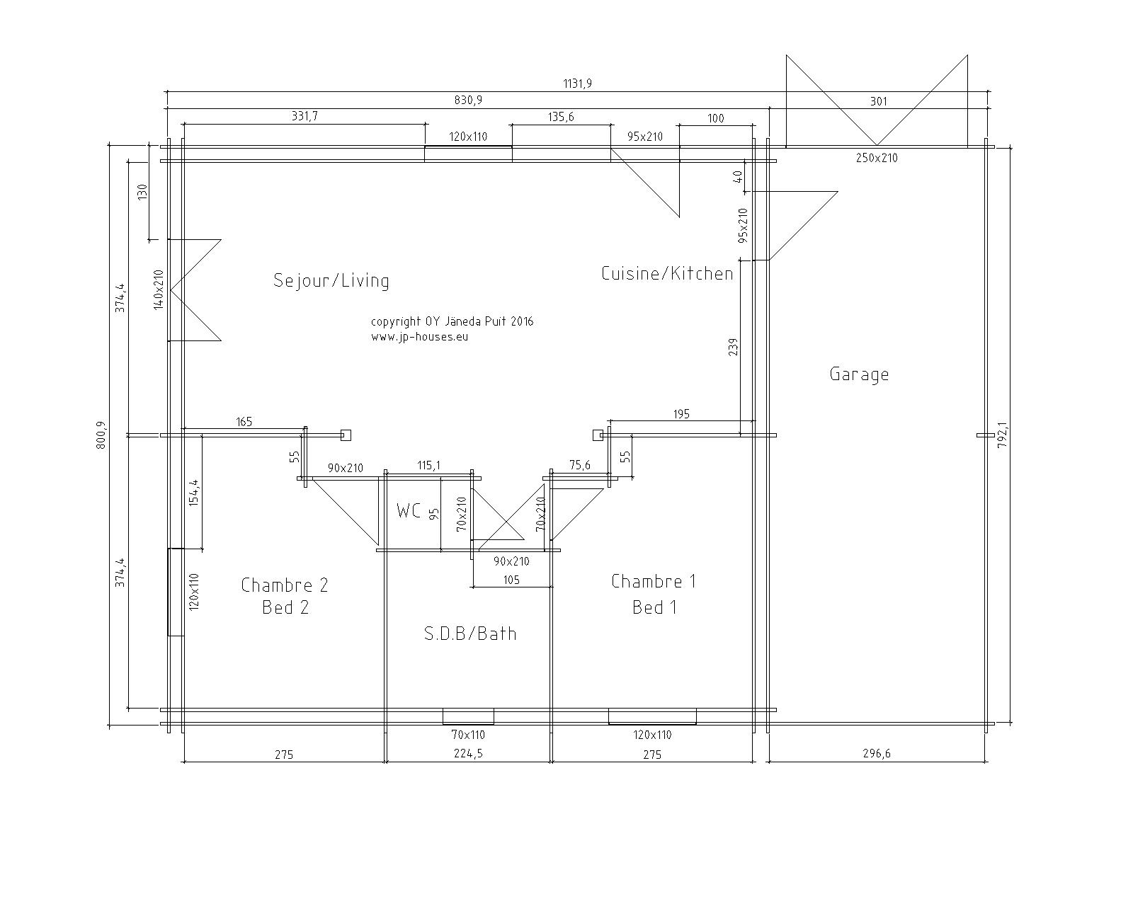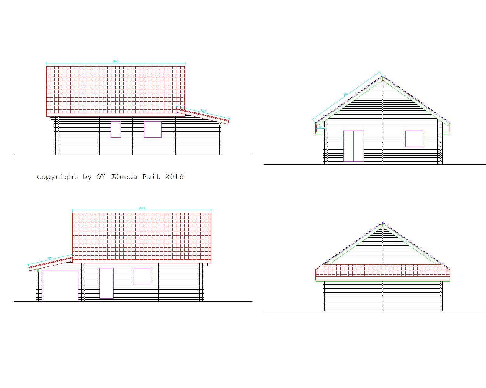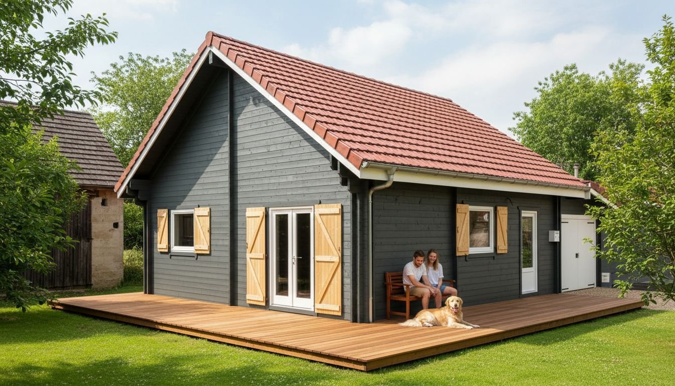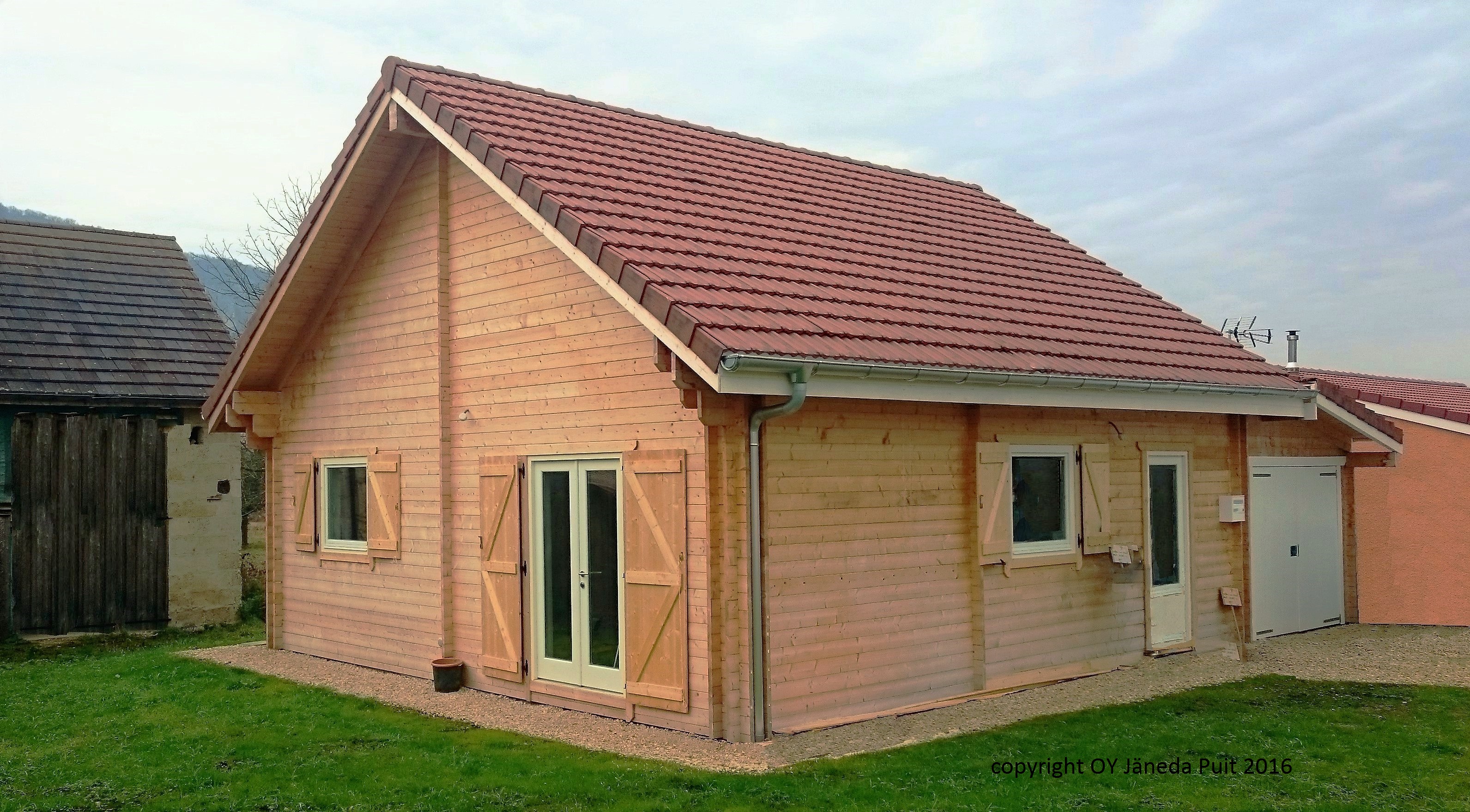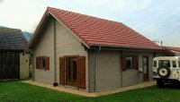 Bretagne 66 sqm plus garage This house has been built as a home for a retired client. His wish was to have an attached garage to the house and the option to build later guest quarters upstairs. This house can be produced as twin skin house or as "hybrid log cabin" both have excellent u values. Some of the pictures are AI modified to show different options and colour choices